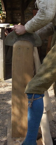This is a 16th century leather worker's stake. It was used for softening leather after it had been tanned. It has a half moon blunt iron knife set into a beachwood stand.